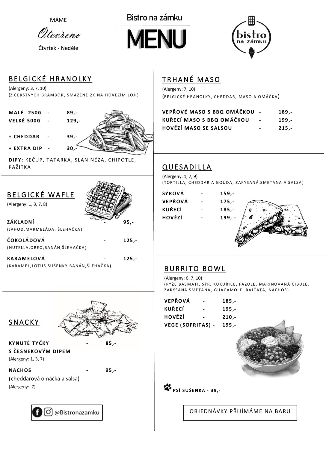 Naší specialitou jsou belgické hranolky smažené z čerstvých brambor na hovězím loji dle originální receptury doplněné o naše domácí dipy. Též připravujeme trhaná masa, quesadillas, polévky a skvělé belgické wafle. Každý den naleznete v naší vitríně několik druhů domácích dezertů jako jsou - Mrkvový dort, pavlova, cheesecake, atd.