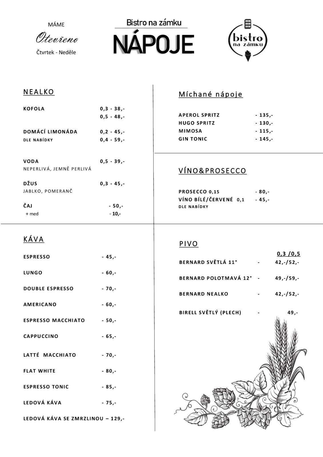 Na čepu máme pivo Bernard. Připravujeme domácí limonády. Kávu odebíráme od Fresh coffe. At už dostanete chut na skleničku prosecca nebo třeba Aperol spritz u nás si přijdete na své.